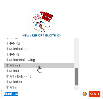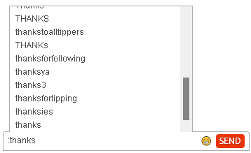 A GIF Code is a block of characters preceded by a colon character. When you type a colon character followed by some characters the Autocomplete window will open and show 20 of the closest character matches to your GIF code. You can use the Up / Down Keyboard Arrow Keys to scroll through the list, or click directly on the items in the list. In the example below I have typed :thanks into the chat bar and the Autocomplete window shows the 20 closest matches: