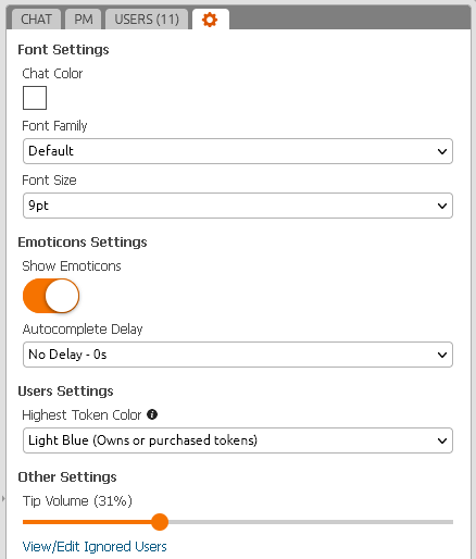 The Orange Switch below the Emoticons Settings controls whether the images will be displayed in the chat. In the above image Show Emoticons it is set to ON. Clicking on it will toggle the setting. When the setting is OFF all the GIFs posted into the chat will be replaced by the GIF code. Under the Show Emoticons switch is the Autocomplete Delay setting. The Autocomplete function is explained in the next section. For now make sure it is set to No Delay – 0s 2. Posting GIFs and using the Autocomplete function: