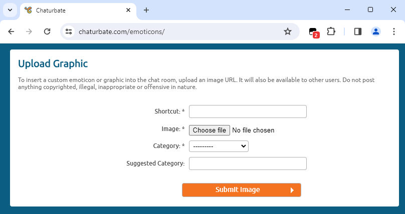 Now we go to Chaturbate’s Graphic Upload Page at https://chaturbate.com/emoticons/ You will see this page: