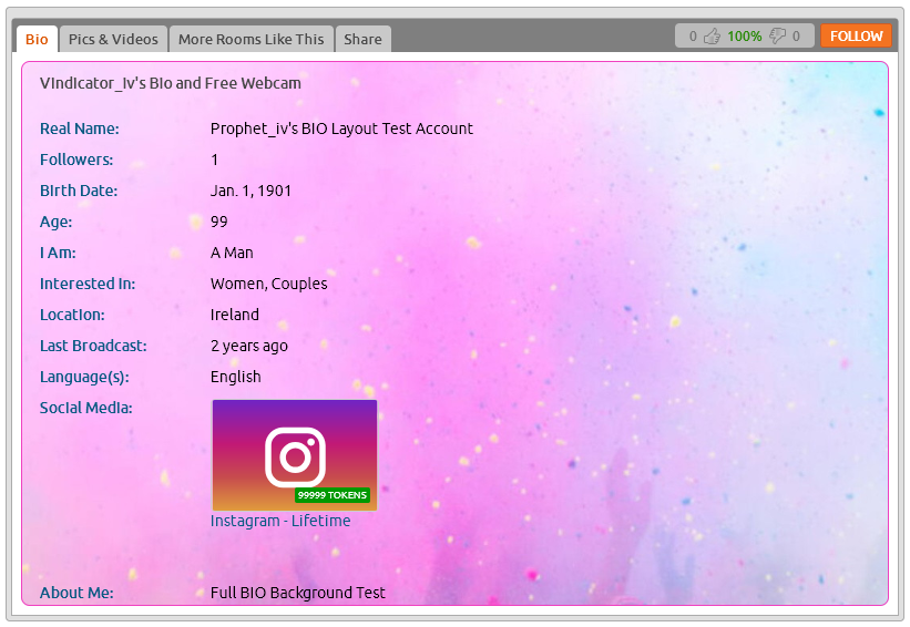 Due to this code change we can now place a background image in the full BIO area using a simple method. Previously we needed to create a parent holding element in the BIO with the background image, play with negative margins and custom widths and padding, then put your main BIO code within it. This could be quite stressful if you were just starting out in BIO design. Now a background image can be placed using just one <p> element placed either in the About Me or Wish List boxes. It can be placed at the start or end of your normal BIO code block. The background image will sit under all the usual Chaturbate BIO information, Photo & Video Sets, and Social Media Links. This guide is part of Prophet's Cam Guide List